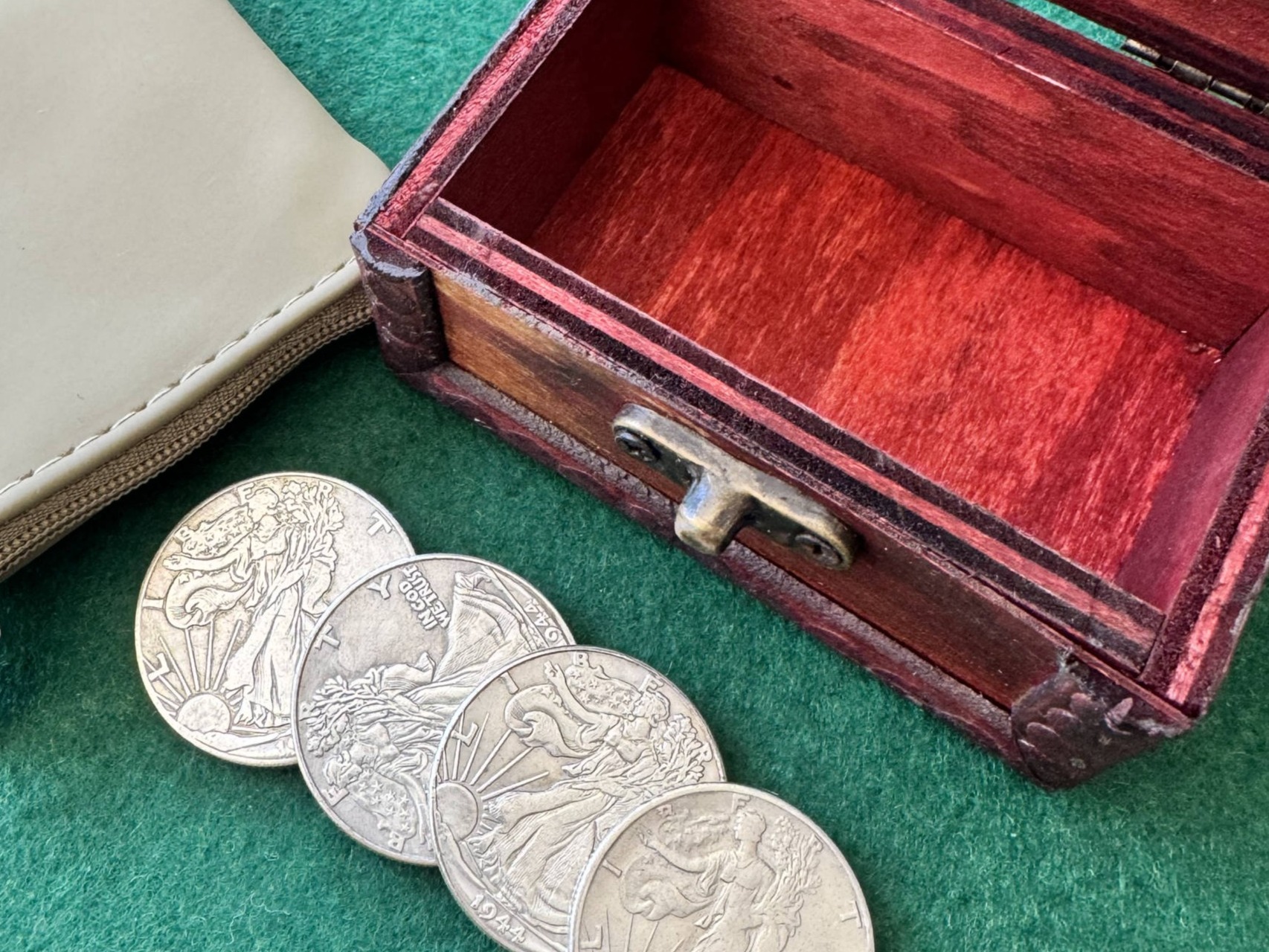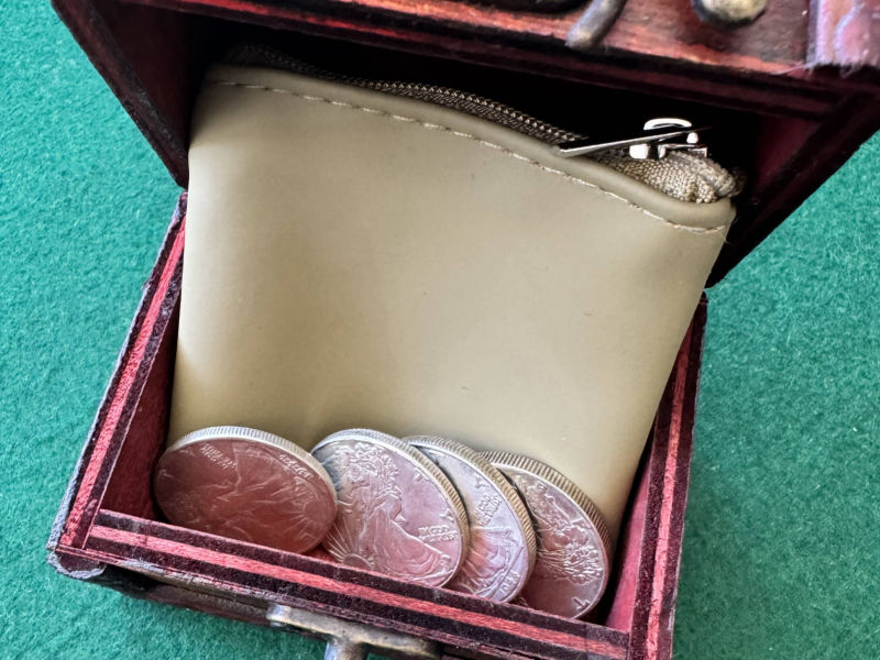 Four coins and a shell. It can be served in Dollar size or Half Dollar. The half dollar is walking Liberty and the Dollar a Morgan. All of them are accurate reproductions made with the finest materials to elevate your performances